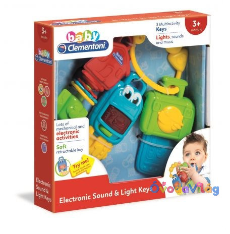 Elektromos kulcscsomó bébi játék - Clementoni ez az elektromos kulcscsomó három kulcsot tartalmaz. Tapintsd ki, hogy melyik kulcs mit nyit. Tartalmaz egy elektronikus kulcsot fényekkel és hangokkal, egy visszahúzható kulcsot és egy csörgő, kattogó kulcsot.