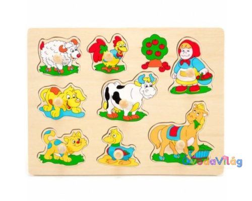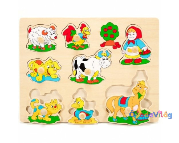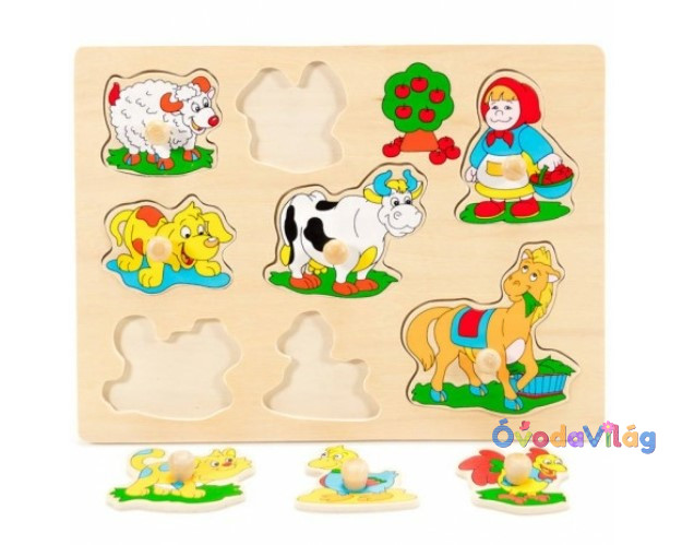 Fogantyús fa kirakójáték - A ház körül a puzzle táblán láthatóak állatok színes ábrái, mellyel könnyen be tudja azonosítani gyermeke a puzzle helyét. Kiváló kikapcsolódást nyújt a gyermekek számára és elősegíti a szem-kéz koordinációs készség valamint a vizuális észlelés képességének fejlődését.