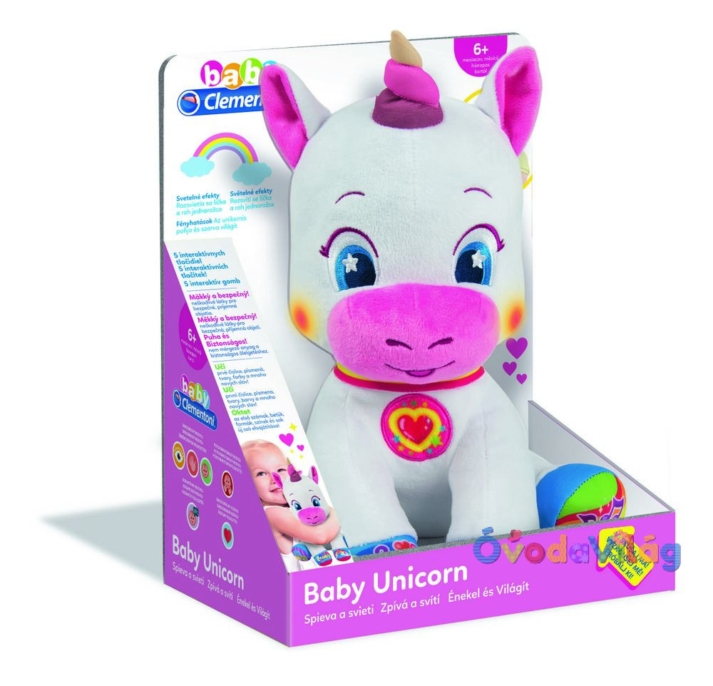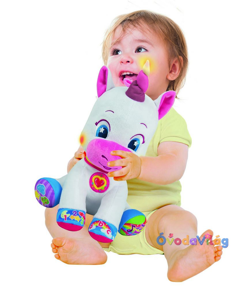 Interaktív unikornis magyarul éneklő Clementoni puha tapintású édes Unikornis, mely pihe puha plüssből készült és a babáknak új felefedezést nyújt! A cuki interaktív Unikornissal megismerheti a baba a színeket és a számokat, formákat és a betőket játékos formában!