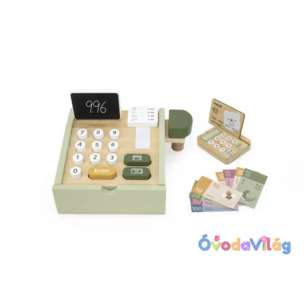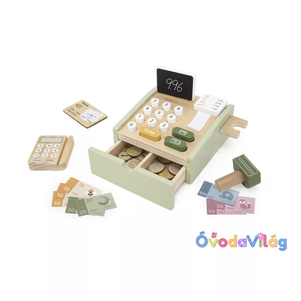 Játék Fa Pénztárgép - zöld pasztell színben zöld pasztell színű pénztárgép nem csupán egy egyszerű játék, hanem egy olyan eszköz, amely játékos módon tanítja meg a gyermekeket a pénz világára és a vásárlás alapjaira.