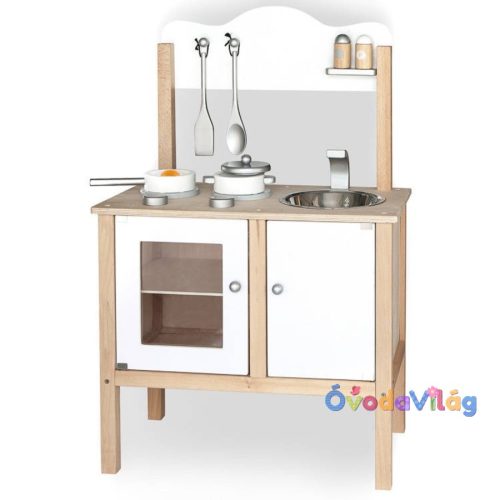 Játékkonyha fából fehér szerepjátékok és a játékbabázás kiegészítője a játékkonyha
